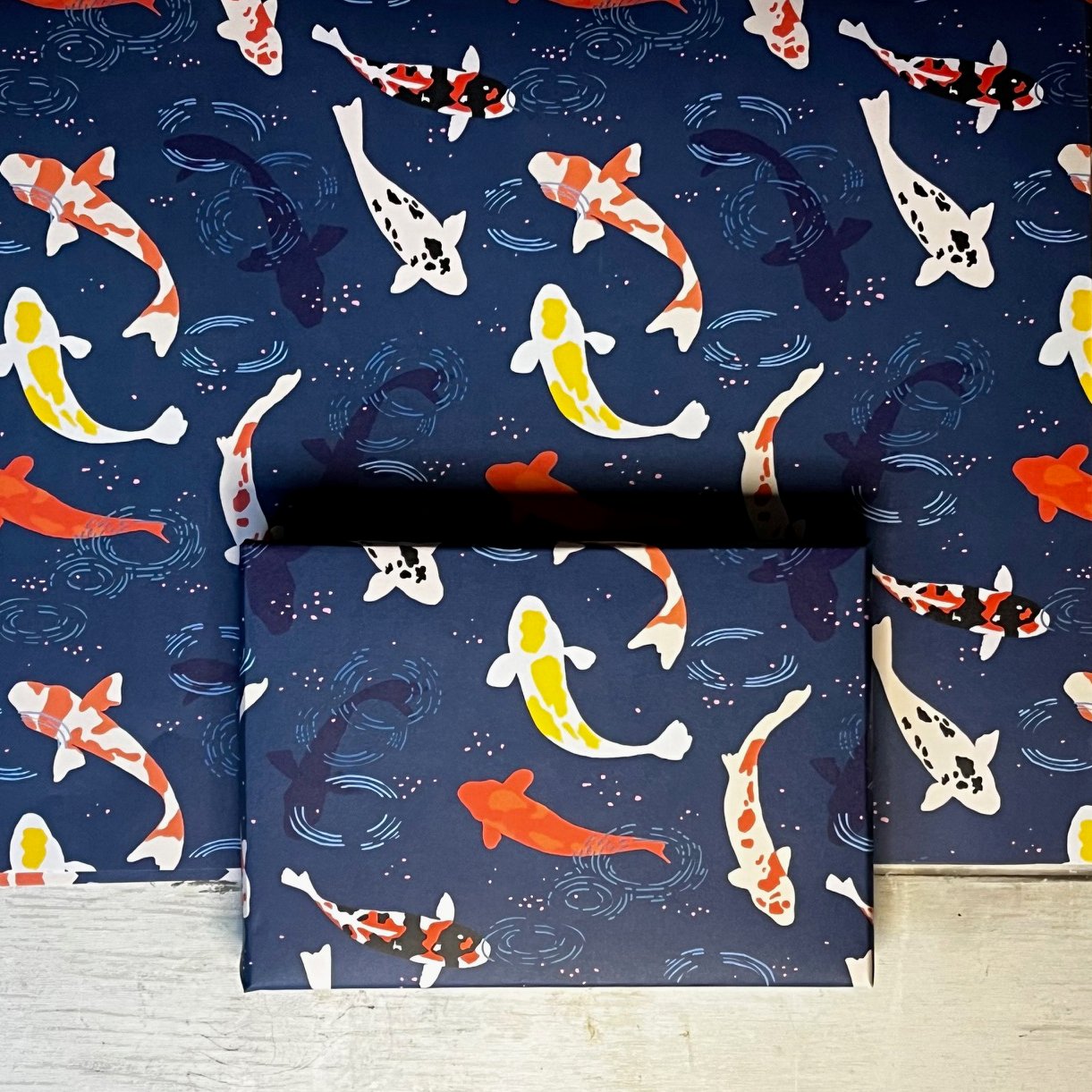 A striking, luxury gift wrap of slowly moving Koi carp with scatterings of maple leaves dotting the surface.